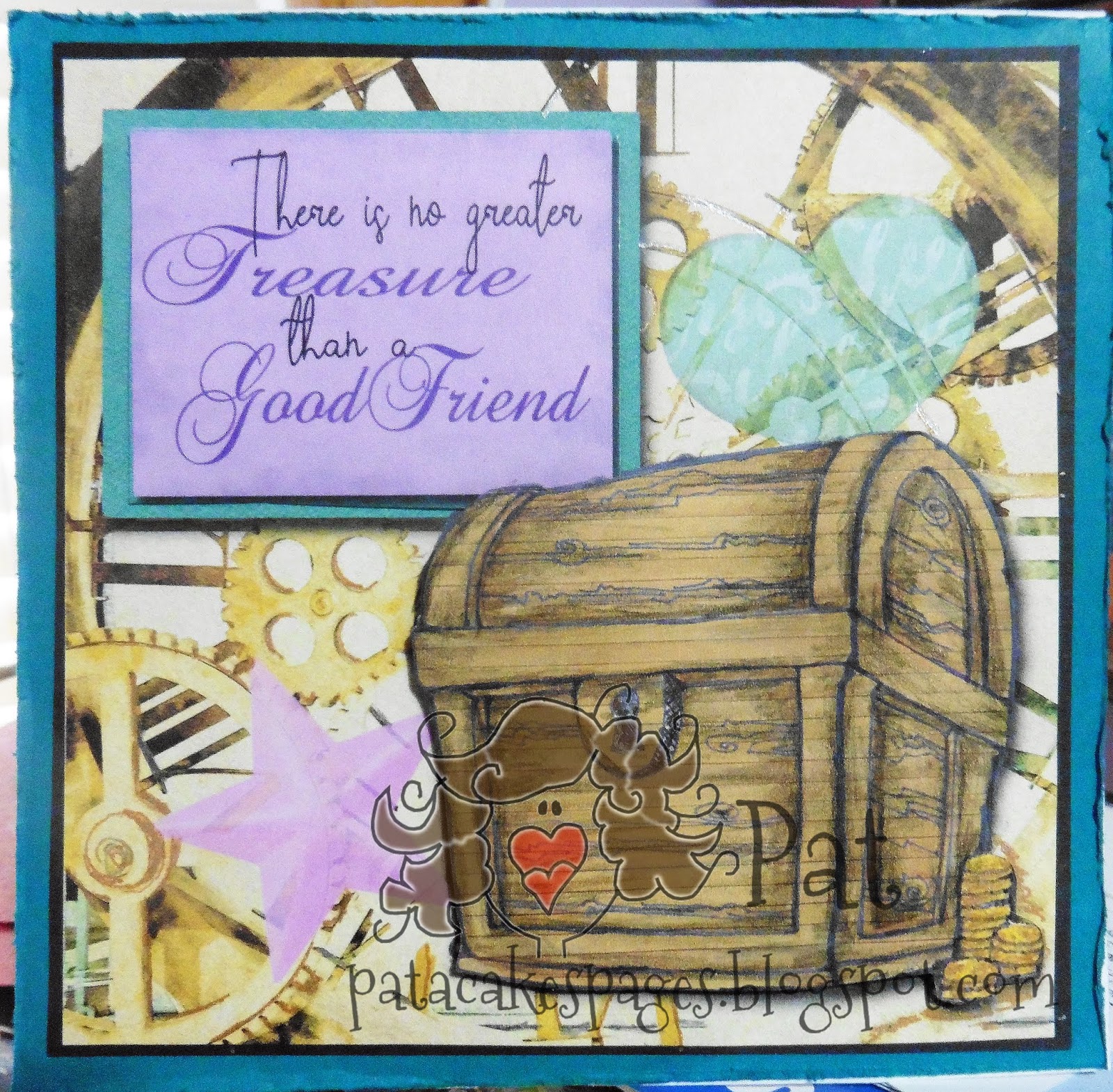I love using Scribbles Designs' Treasure Chest with the sentiment above: There is no greater Treasure than a Good Friend". What a perfect pairing, right? Since this card is going to a veteran I met at the VA hospital, I kept the design simple.