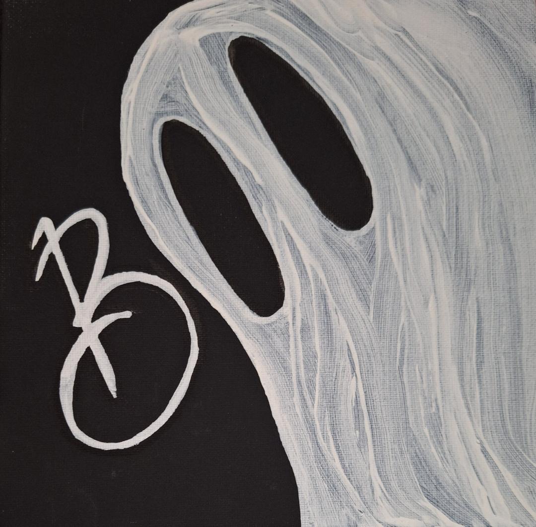 I got out my canvases and acrylic paints today! Although I used black canvases, I always like to paint them black as well. That's so the rest of the paint doesn't get soaked into the canvas. After the background paint dried, I drew out the shape of my ghost with a white Posca paint marker, then his eyes.